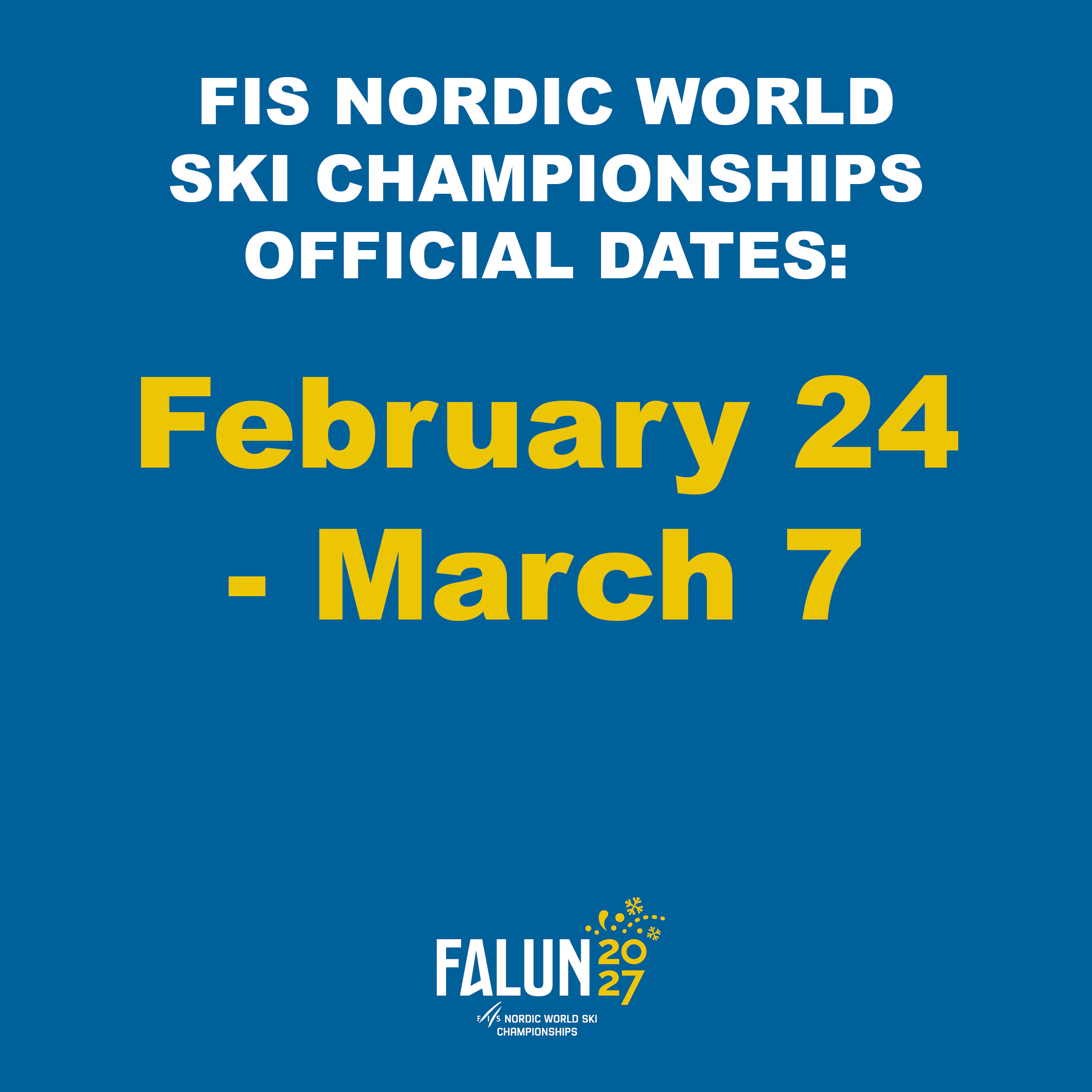 FIS Nordic World Ski Championships 2027 in Falun is happy to officially announce the dates of the competitions, which will be held between the 24th of February 24 and the 7th of March 2027.